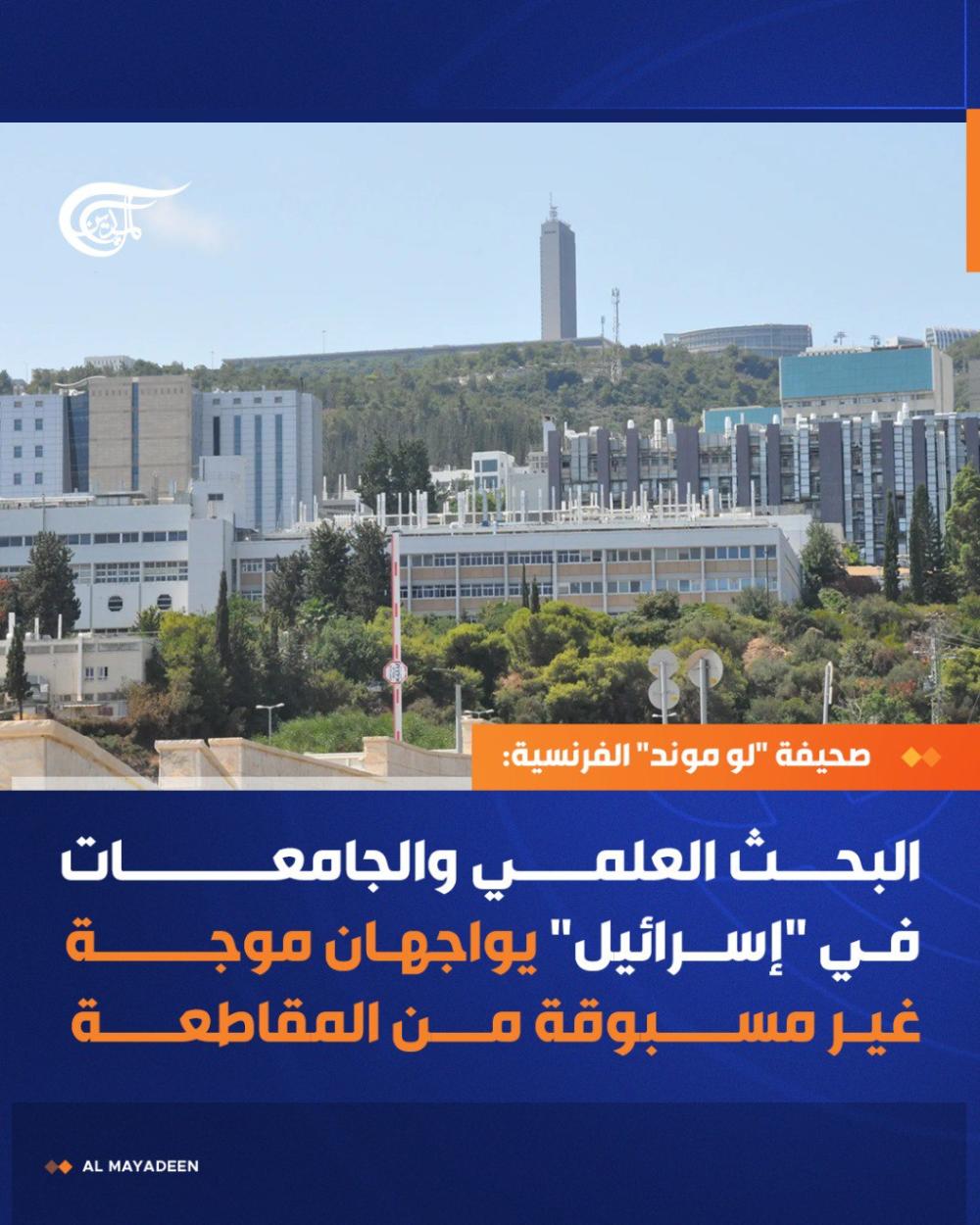 قالت صحيفة "لو موند" الفرنسية، في تقرير لها، أن البحث العلمي والجامعات في "إسرائيل" يواجهان مقاطعة غير مسبوقة.