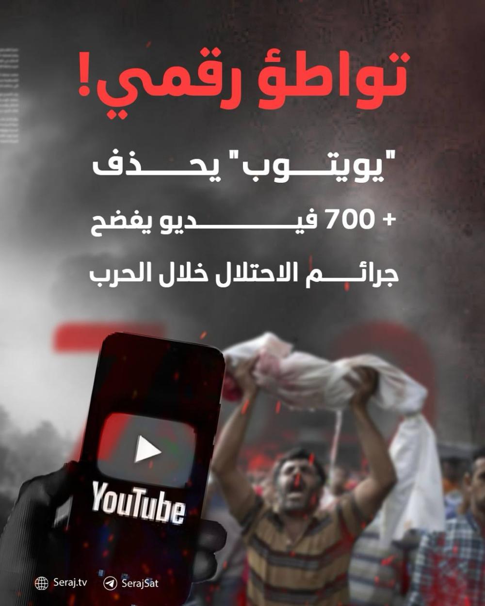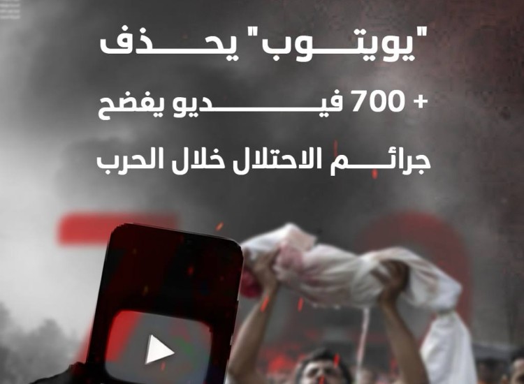 - ندين حذف "يوتيوب" قنوات ثلاث منظمات فلسطينية كبرى لحقوق الإنسان، ما أدى إلى مسح أكثر من 700 فيديو توثق جرائم الحرب الإسرائيلية.