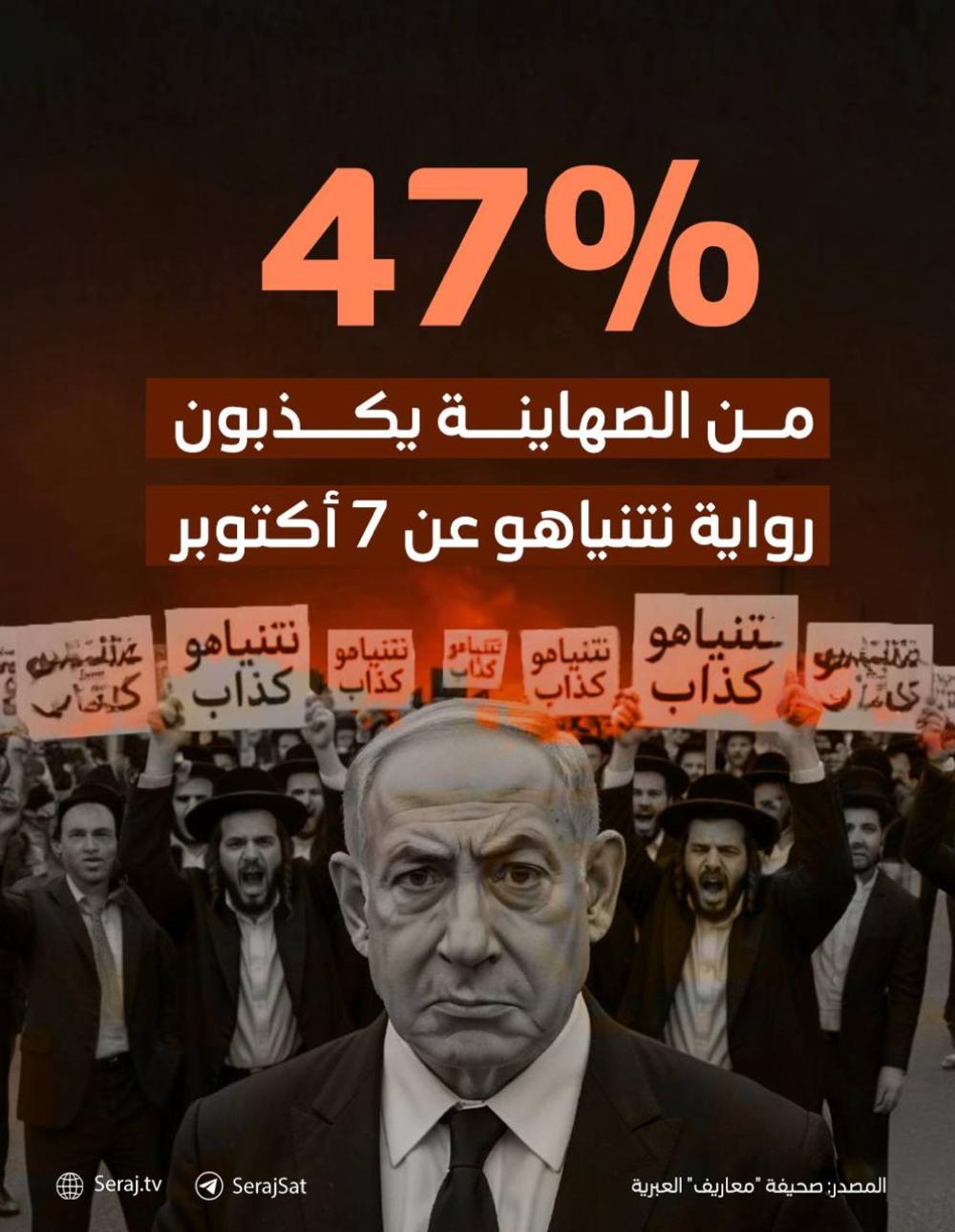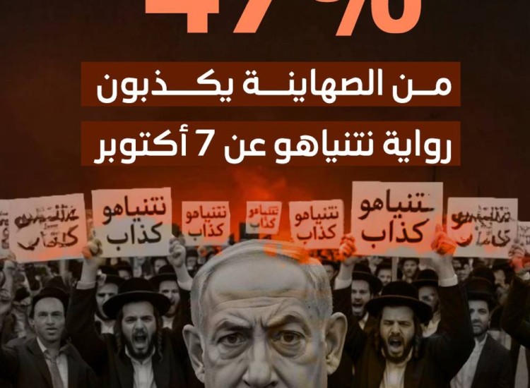 - أظهر استطلاع للرأي أن 47% من "الإسرائيليين" لا يصدقون رواية نتنياهو بشأن الأحداث التي أدت إلى هجوم 7 أكتوبر/تشرين الأول 2023، مقابل 28% يصدقونها، بينما قال 25% إنهم لا يعرفون.