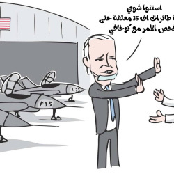 العنوان: رسم كاريكاتيري من صحيفة هآرتس يشير إلى تعليق الرئيس جو بايدن لبيع صفقه الطائرات للإمارات