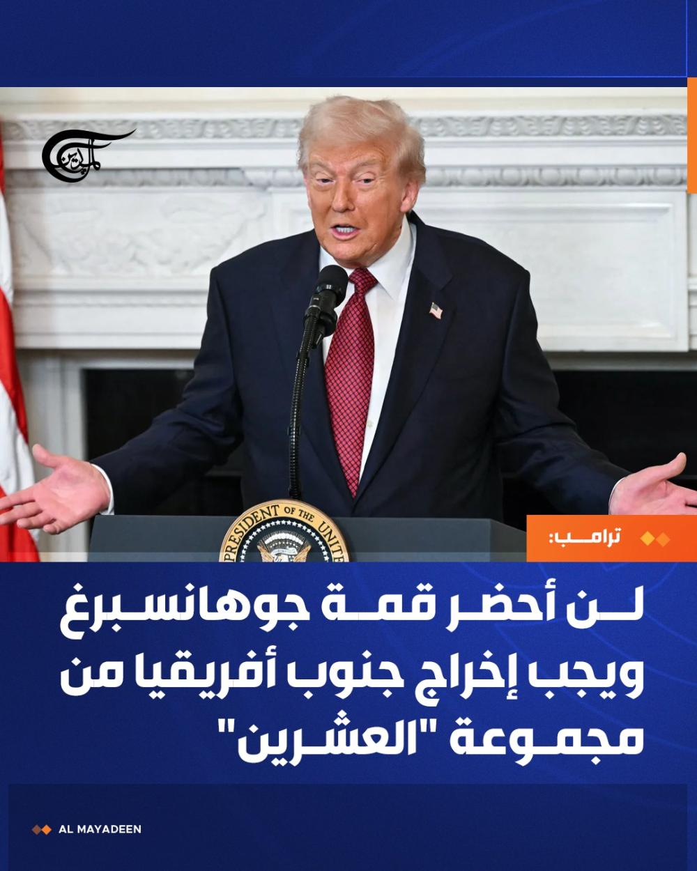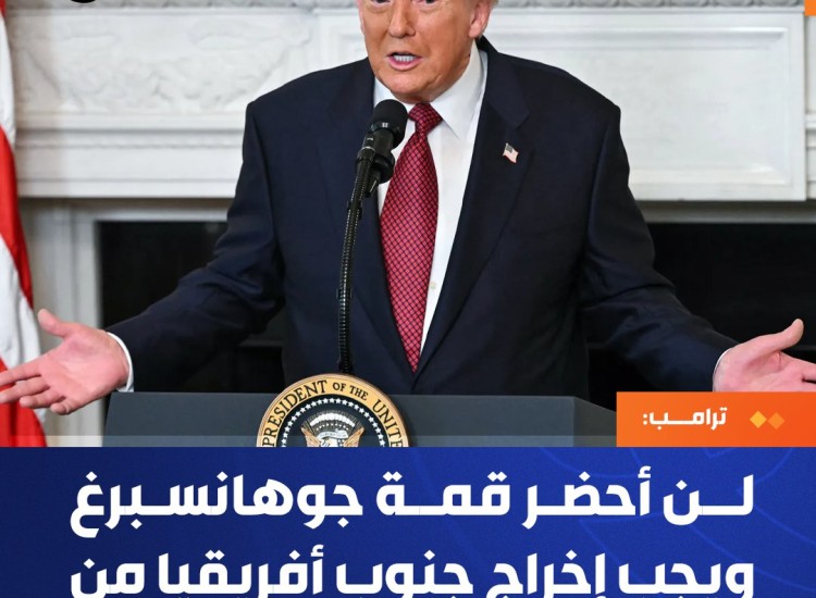 أعلن ترامب أنه لن يحضر قمة مجموعة "العشرين" في جوهانسبرغ يومَي 22 و23 تشرين الثاني/نوفمبر، مطالباً بإخراج جنوب أفريقيا من المجموعة، واصفاً سياسات الأخيرة بأنها سيئة، واتهامها "بمصادرة الأراضي ومعاملة البيض بشكل سيئ." من جهتها، رفضت حكومة جنوب أفريقيا هذه الادعاءات معتبرة أنها قائمة على فرضية غير دقيقة. ويرى مراقبون أن التصعيد الأميركي مرتبط بالدعوى التي رفعتها جنوب أفريقيا ضد "إسرائيل" أمام محكمة العدل الدولية بتهمة ارتكاب جريمة الإبادة الجماعية في #غزة.
